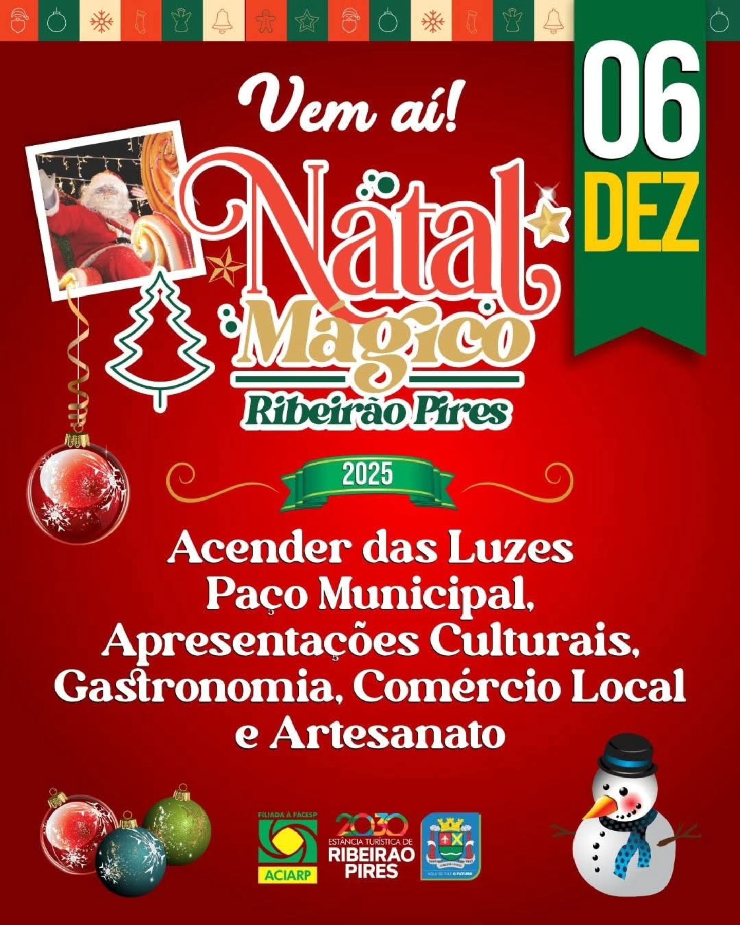 A magia do Natal tomará conta de Ribeirão Pires a partir do próximo dia 6 de dezembro, quando o Paço Municipal será palco da abertura oficial do Natal Mágico 2025. A Prefeitura juntamente com a ACIARP (Associação Comercial, Industrial e Agrícola de Ribeirão Pires), patrocinadores e comerciantes da região central iniciarão oficialmente as festividades natalinas na cidade.